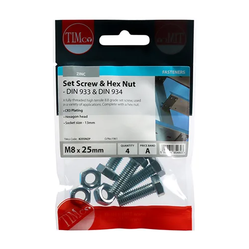 A fully threaded high tensile set screw with hex nut, used in a wide variety of applications. NOTE: Nuts included.Plated in Trivalent Chromium (Cr3) Zinc.Manufactured from grade 8.8 carbon steel.